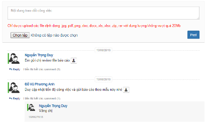 - Tất cả mọi người có liên quan đến công việc (người giao việc, người xử lý chính, người tham gia phối hợp) đều có thể sử dụng chức năng trao đổi công việc để phối hợp xử lý công việc, có thể đính kèm các file cần gửi lên hệ thống.